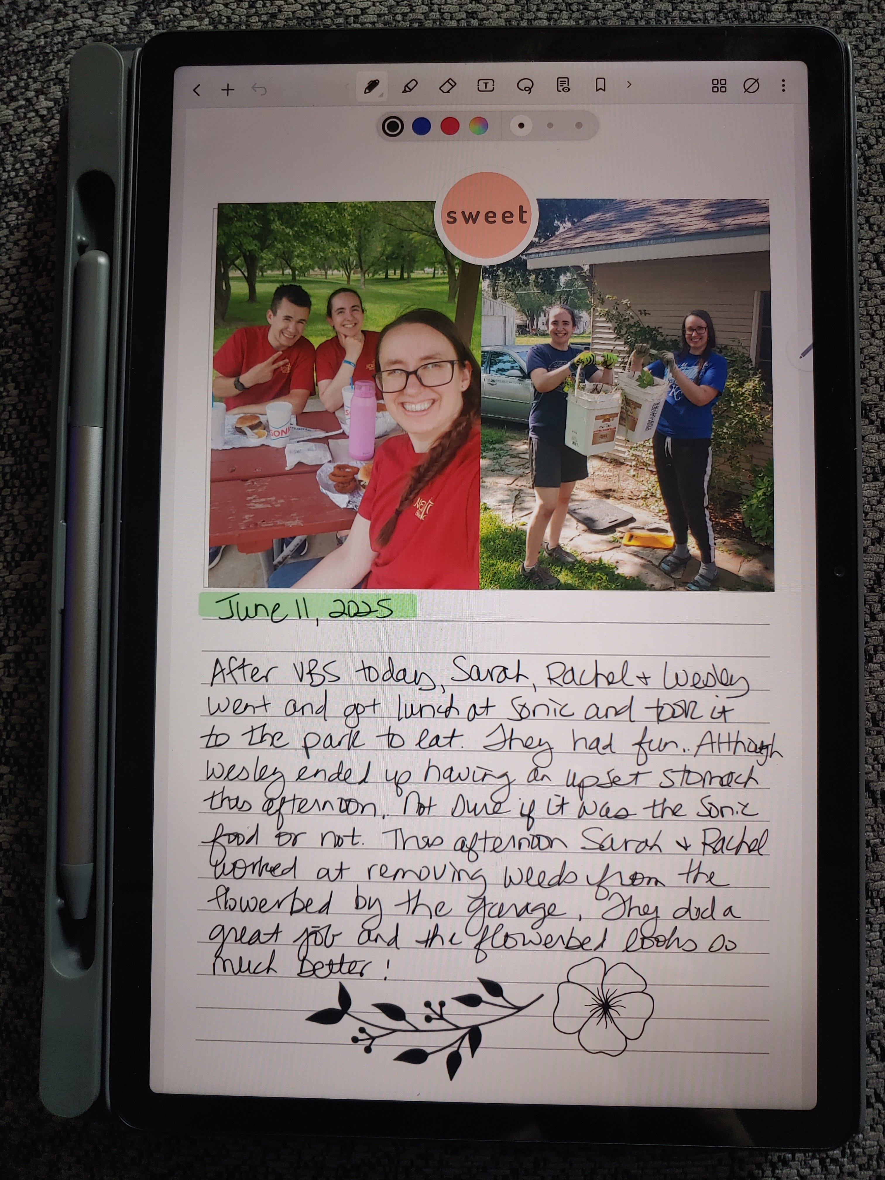 I’m still really enjoying my new tablet. I started a Photo Journal where I can insert pictures on the top half of the page, then write on the bottom half. I can even add stickers! How fun!