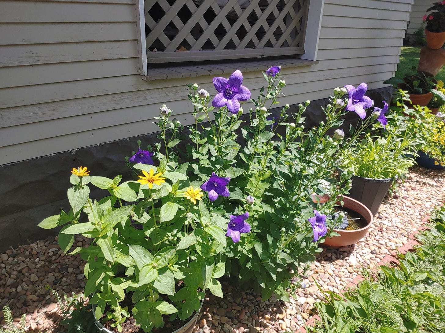 This week the beautiful balloon flowers opened up! They are the purple flowers in the above picture. Aren’t they so pretty? The weather is starting to warm up — the hot and humid days of Kansas! The flowers are loving the sunshine though and we are really enjoying them.